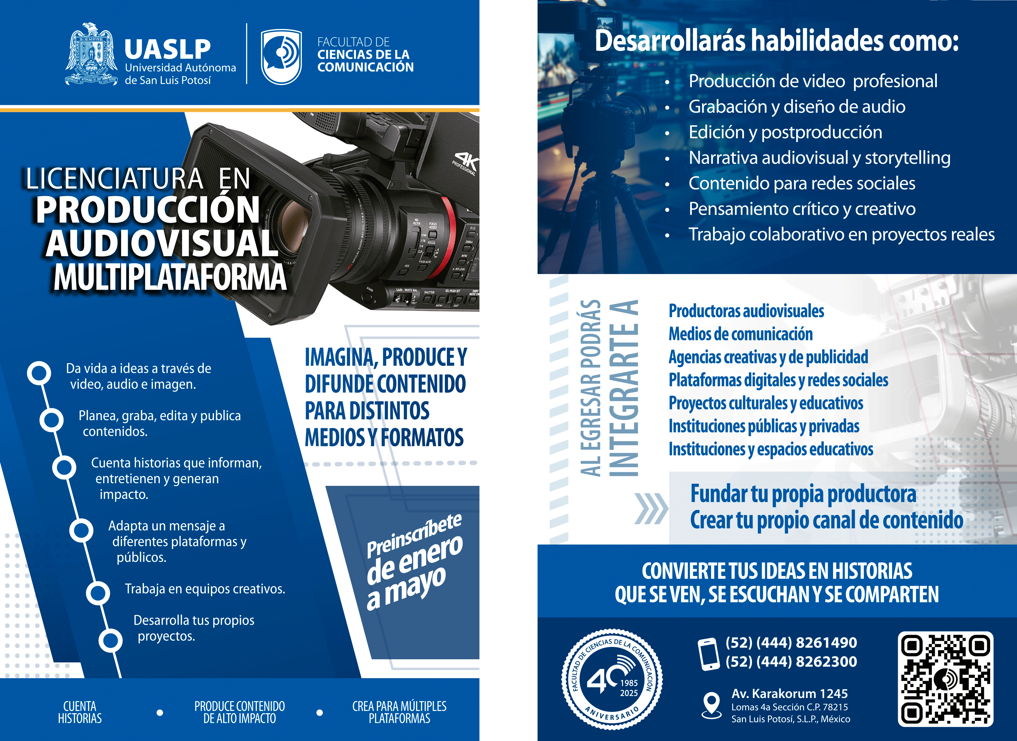 | El egresado de la Licenciatura en Producción Audiovisual Multiplataforma deberá poseer actitudes y valores alineados con el humanismo, la ética, la inclusión, la responsabilidad digital, la sostenibilidad y la creatividad crítica, expresados en su comportamiento profesional, en su participación social y en su producción de contenidos multimedia, conforme a los principios establecidos por la UASLP |
